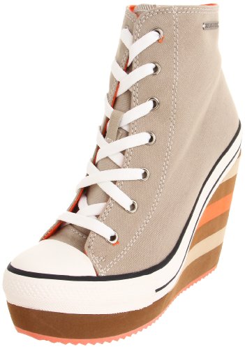 Add superstar style for miles with this high top lace-up sneaker featuring a striped eva wedge on an unique jigsaw bottom. By Rock & Candy